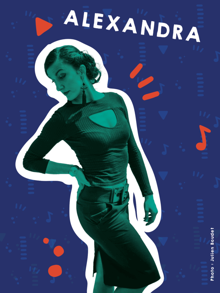 Danseuse professionnelle depuis 2004 pour de nombreuses compagnies, chorégraphe et metteuse en scène , Alexandra est Diplômée d’Etat par le Centre National de la Danse en contemporain depuis 2007. Son parcours interdisciplinaire, nourrissant sa curiosité sans limites-théâtre, cirque, marionnette, danses afro-contemporaine, blues, urbaines, swing, et afro-latines- imprègne ses cours d’une dimension artistique aux outils variés (cours techniques, ateliers d’improvisation, de composition, travail chorégraphique…) Alexandra est passionnée par les danses depuis 35 ans et par la transmission qu’elle pratique professionnellement depuis 20 ans, du tout petit au senior et du débutant au professionnel. Elle enseigne en France et en Europe (SP, DE, NL, IT, LIT, BLR…) et notamment en solo blues depuis l’obtention de son diplôme de professeur de danses blues obtenu à Bluemove BCN en 2020 auprès de Noemi Blue et Miguel Angel Cruz. Formée aussi sur de nombreux festivals internationaux, elle est repérée grâce aux podiums régulièrement obtenus en compétition solo et couple, mais aussi par l’originalité de ses showcases et ateliers. Recherches ludiques, qualité de mouvement, et musicalité sont associés à son dynamisme et sa bonne humeur!